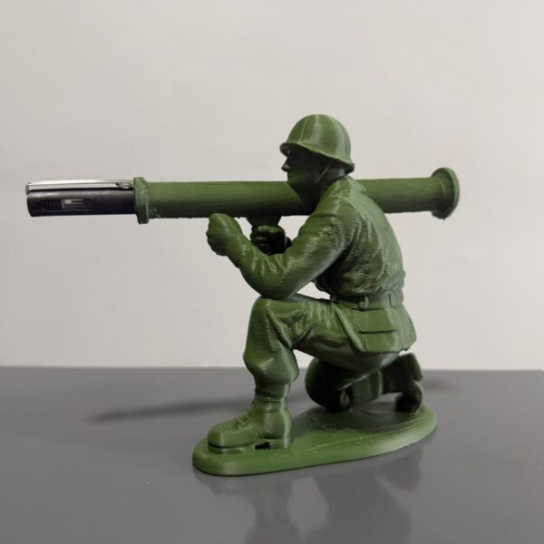 O design representa um soldado ajoelhado em posição de ataque, utilizando um lançador que funciona como suporte para canetas, unindo estilo bélico, realismo e funcionalidade em uma única peça. Ideal para quem curte o universo militar, guerra, sobrevivência e decoração temática.