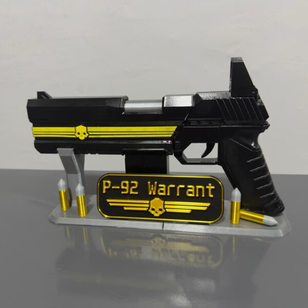 Cada detalhe foi cuidadosamente reproduzido para capturar o design funcional e futurista da P-92, tornando esta peça um destaque absoluto em qualquer coleção geek ou setup gamer.